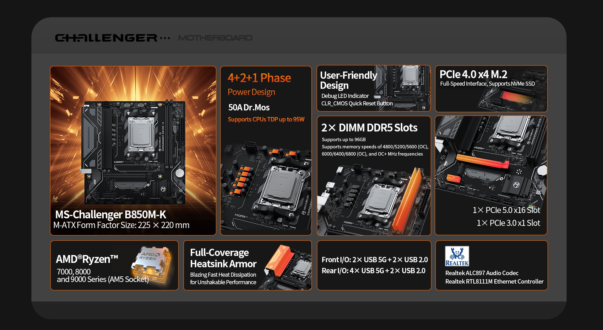 - AMD® AM5 Socket, compatible with AMD® Ryzen™ 7000, 8000, 9000 Series processors