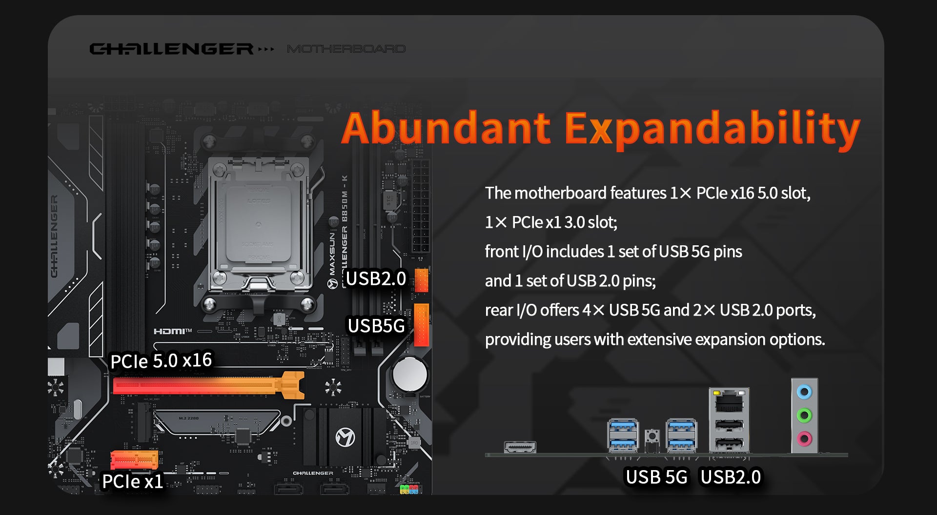 - 1× PCIe x16 slot (supports PCIe 5.0 x16)
