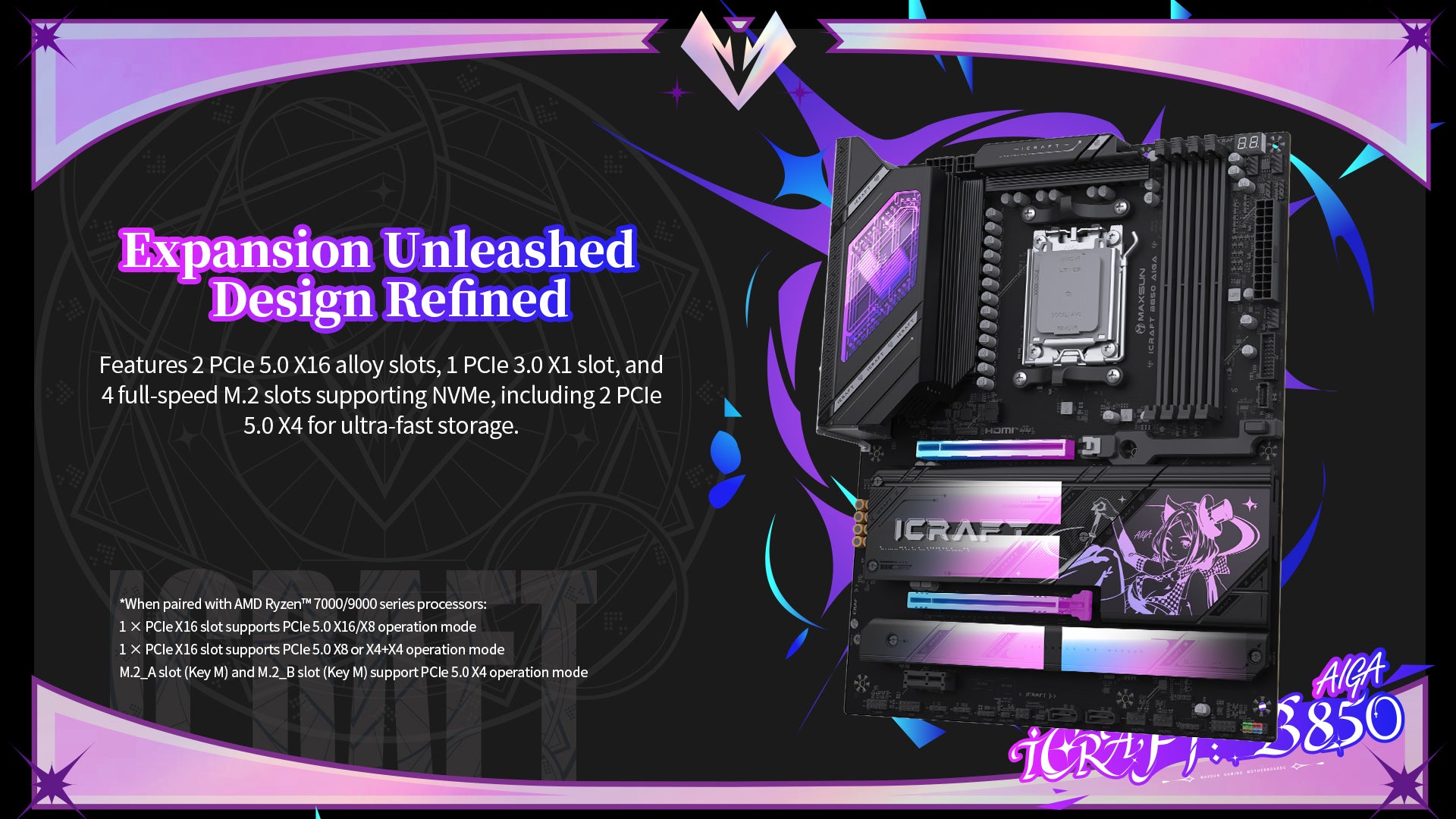 • 1 × PCIe x16 slot (up to PCIe 5.0 x8 or x4+x4 when bifurcation enabled; requires PCIeX16_A switch; Ryzen 8000 disables this slot)