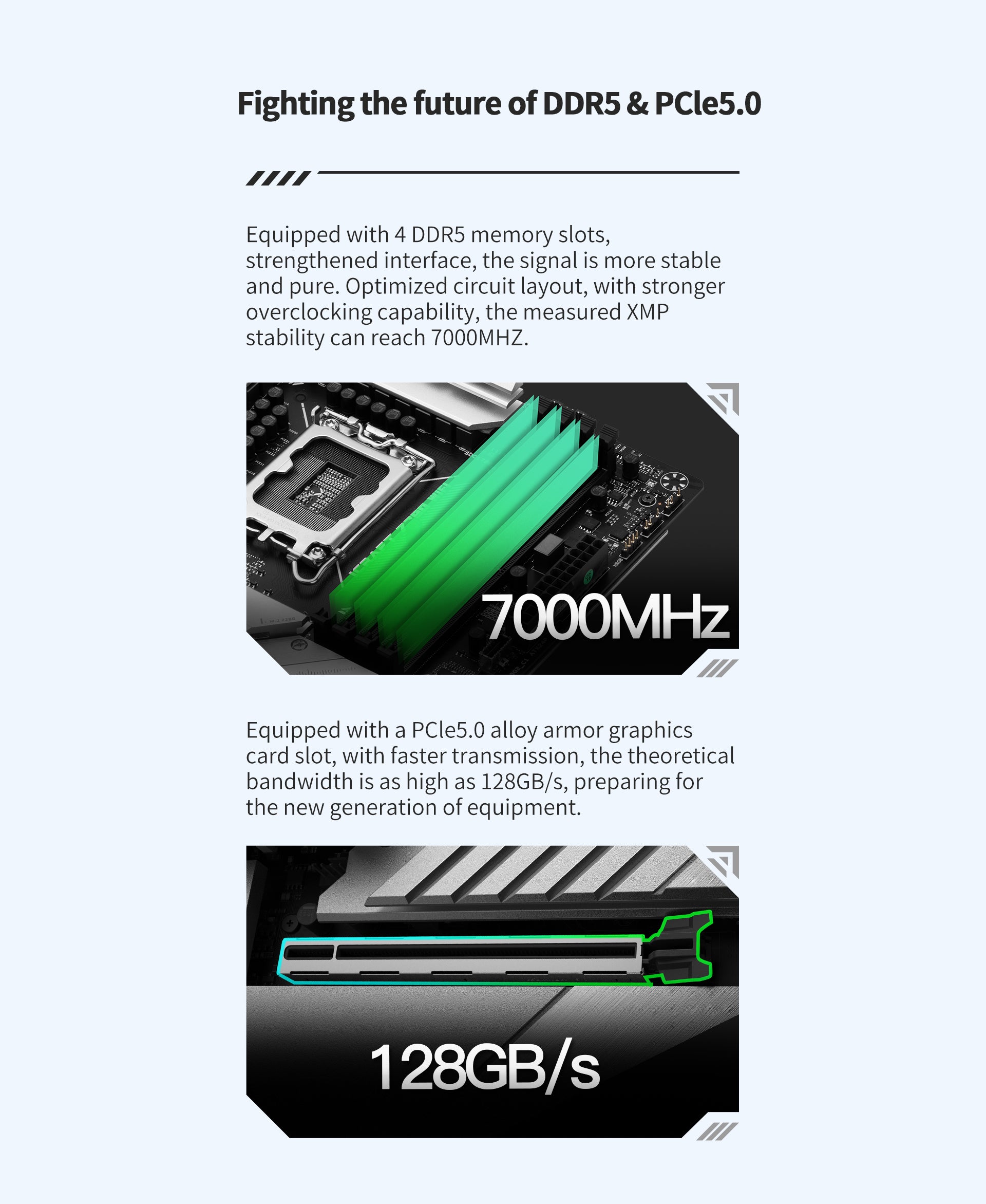 Memory Support DDR5 7000+(OC)/ 6800(OC)/ 6600(OC)/ 6400(OC)/ 6200(OC)/ 6000(OC)/ 5800(OC)/ 5600(JEDEC)/ 5400(JEDEC)/ 5200(JEDEC)/ 5000(JEDEC)/ 4800(JEDEC) MHz