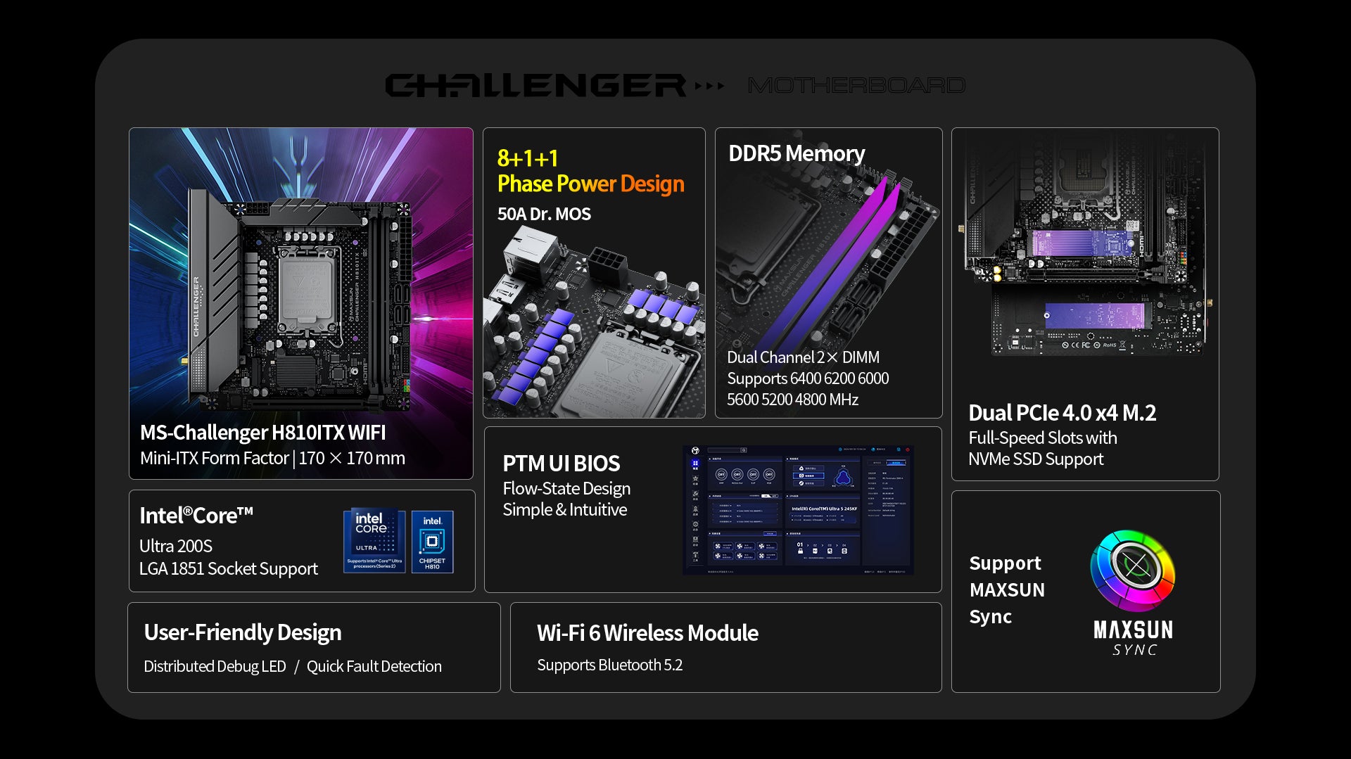 - Smart Control & Custom Lighting: PTM UI BIOS + MAXSUN Sync