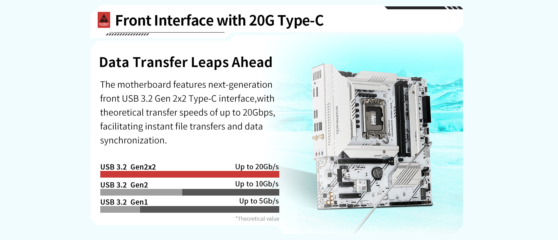In-board pins: 1 set (2) USB2.0 pins, 1 set (2) USB3.2 GEN1 pins,One USB3.2 Gen2x2 Type-C(20G) front interface