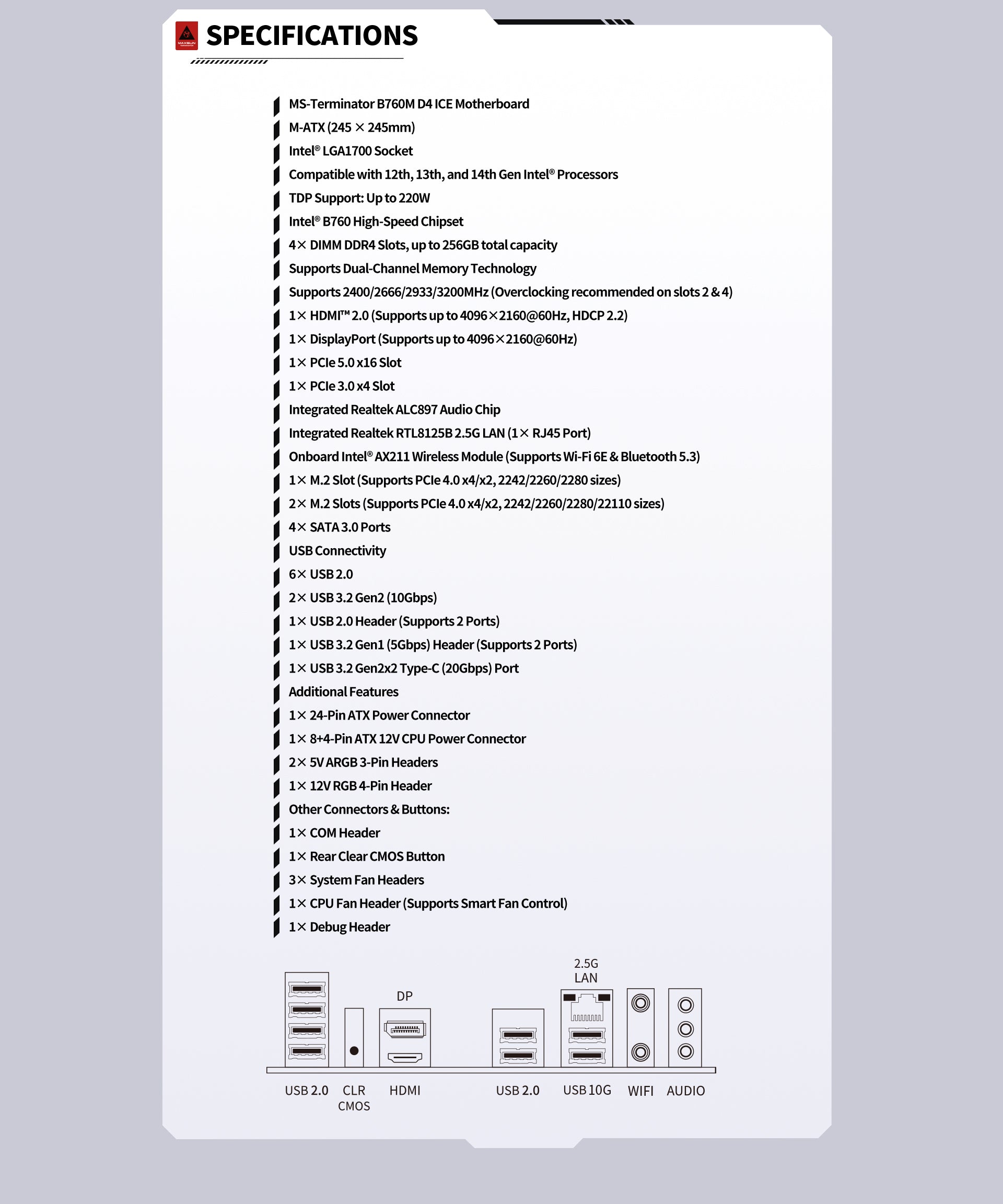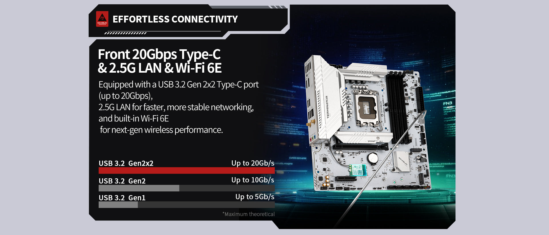 - High-Speed Connectivity: 20Gbps Front USB 3.2 Gen2x2 Type-C, 2.5Gbps LAN, and Wi-Fi 6E for ultra-fast data transfers and smoother gaming experiences.