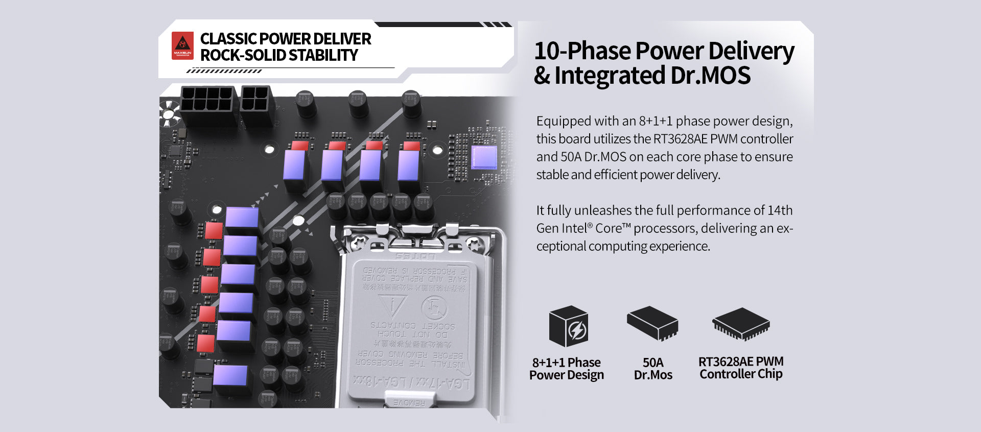 Delivers stable power and supports memory up to 8400MHz (OC+).