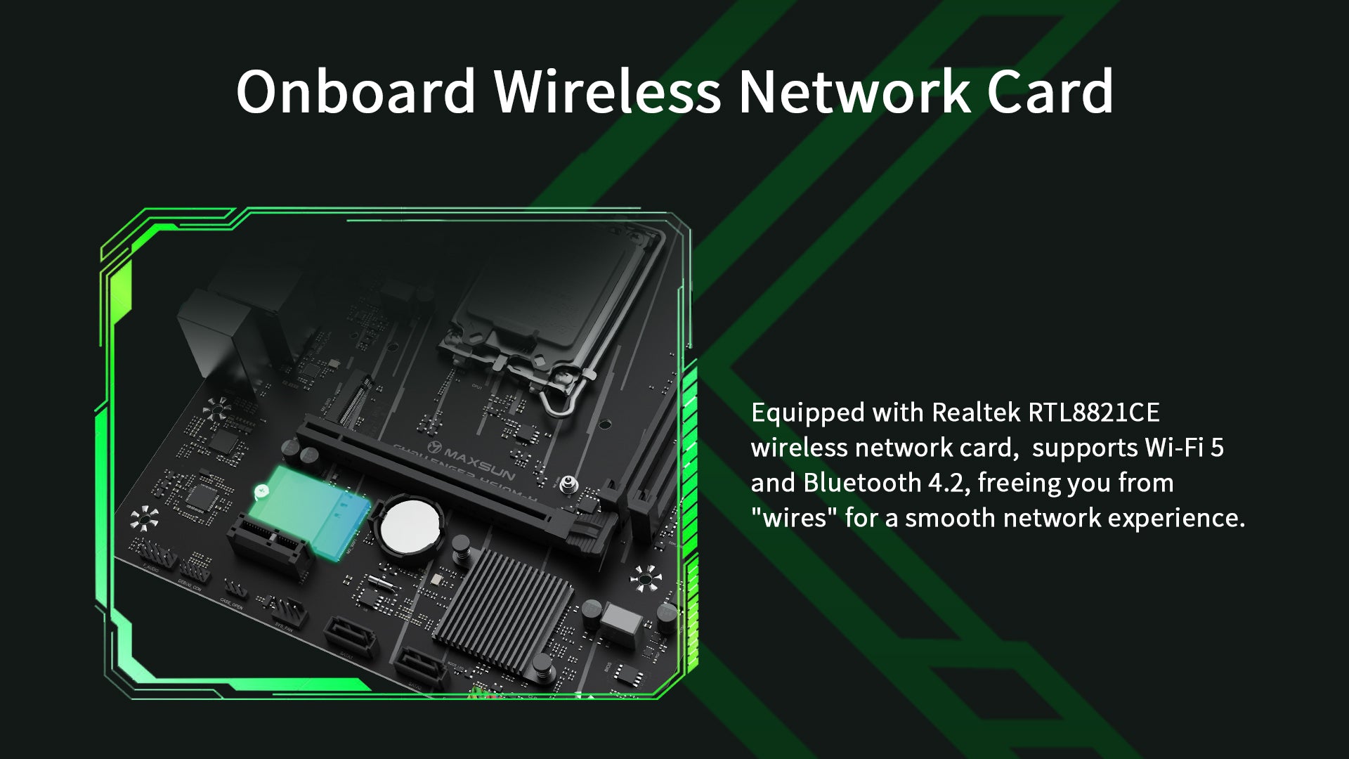 Onboard Realtek RTL8821CE wireless module, supports Wi-Fi 5 & Bluetooth 4.2