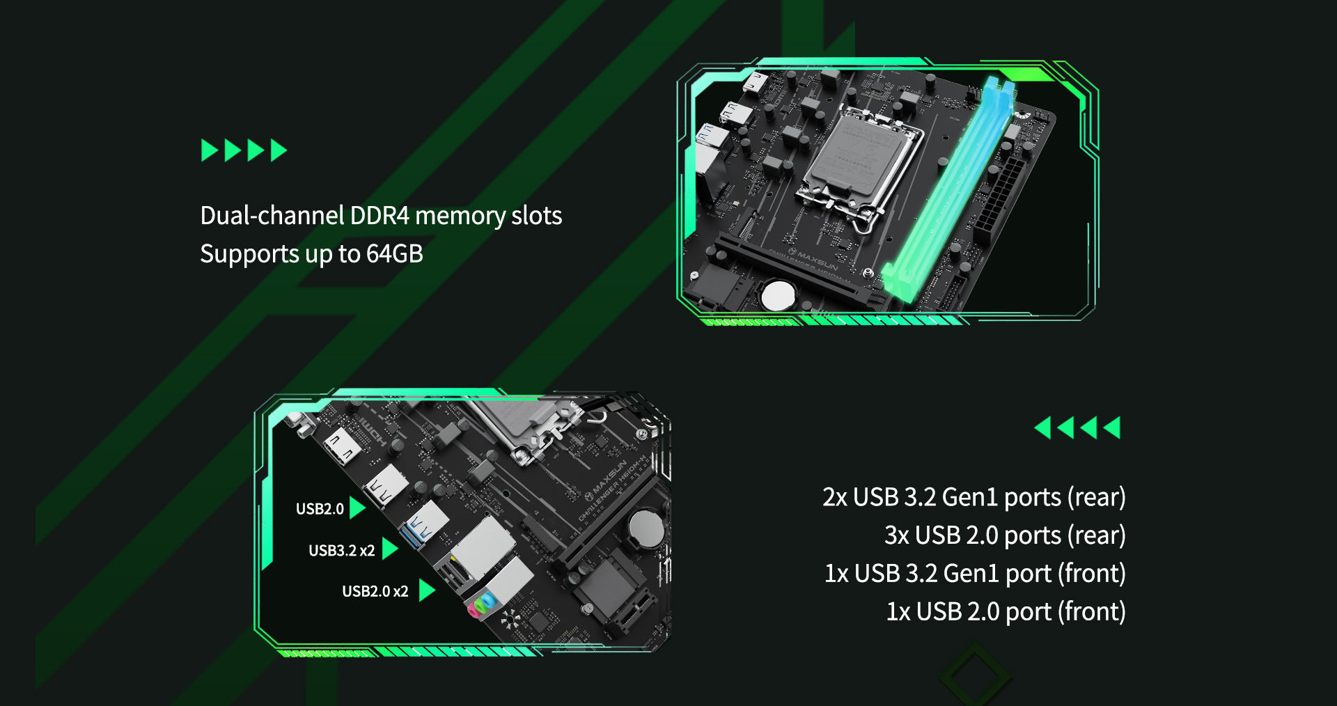 - 2× DIMM DDR4 memory slots, supports up to 64GB