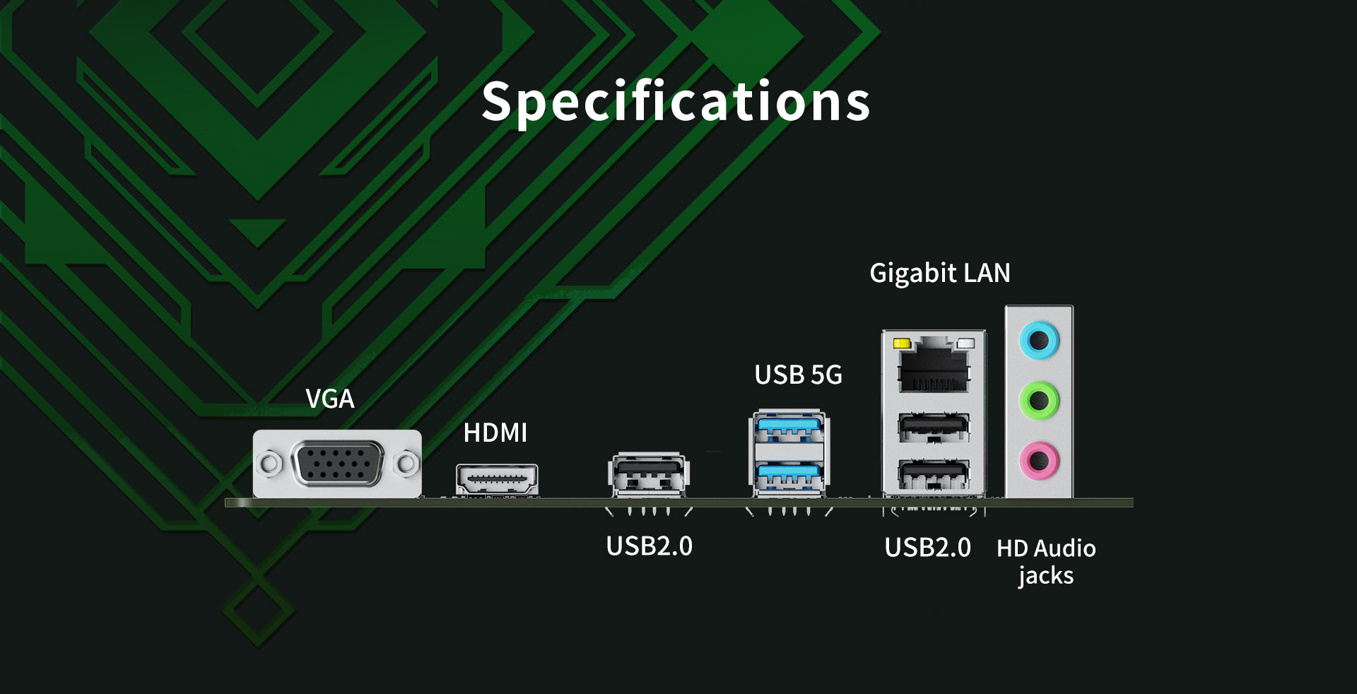 - Rear I/O: 2× USB 3.2 Gen1 ports, 3× USB 2.0 ports