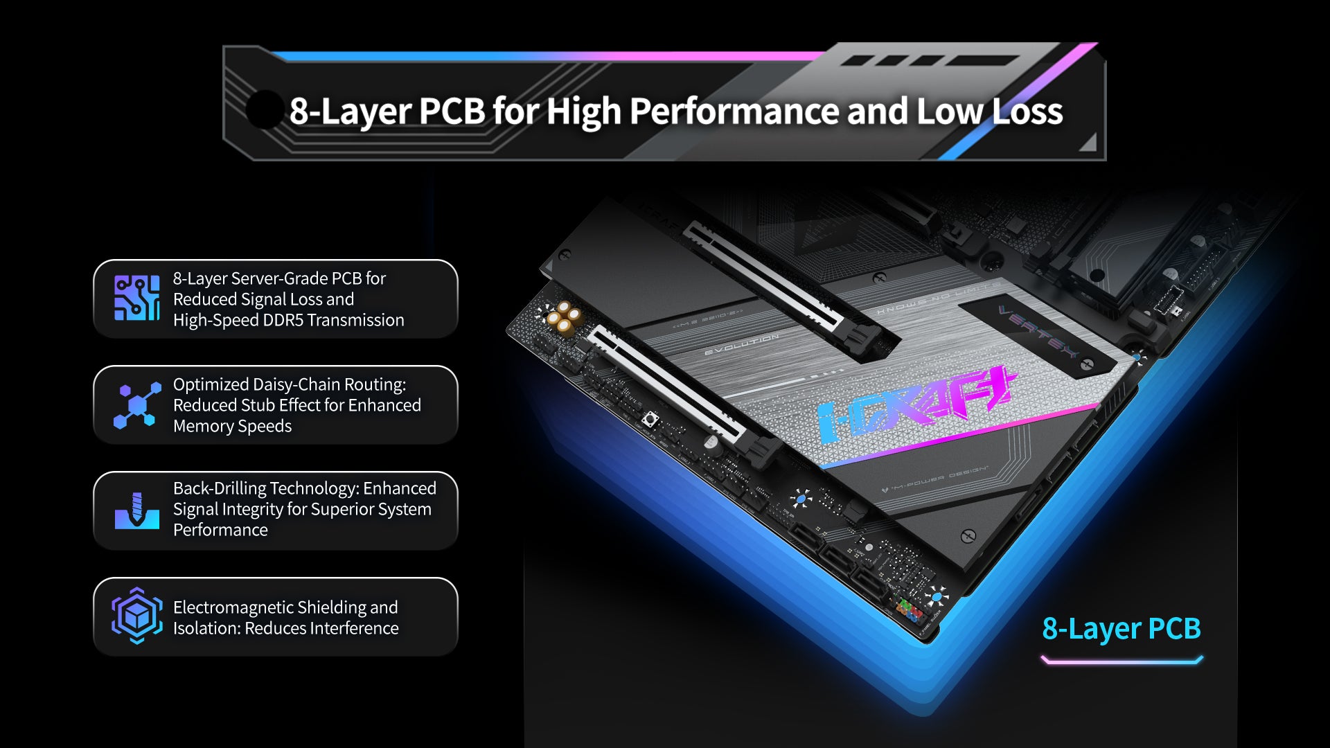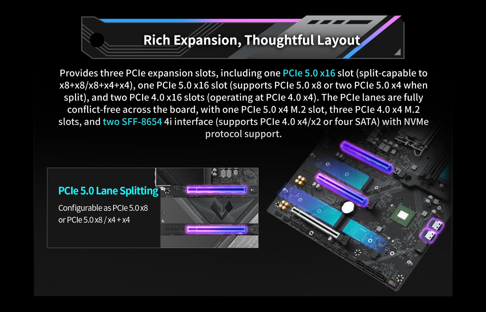 - PCIe Slots: 1 x PCIe 5.0 X16 (supports X16, X8+X8 split), 1 x PCIe 5.0 X8, 1 x PCIe 4.0 X4.