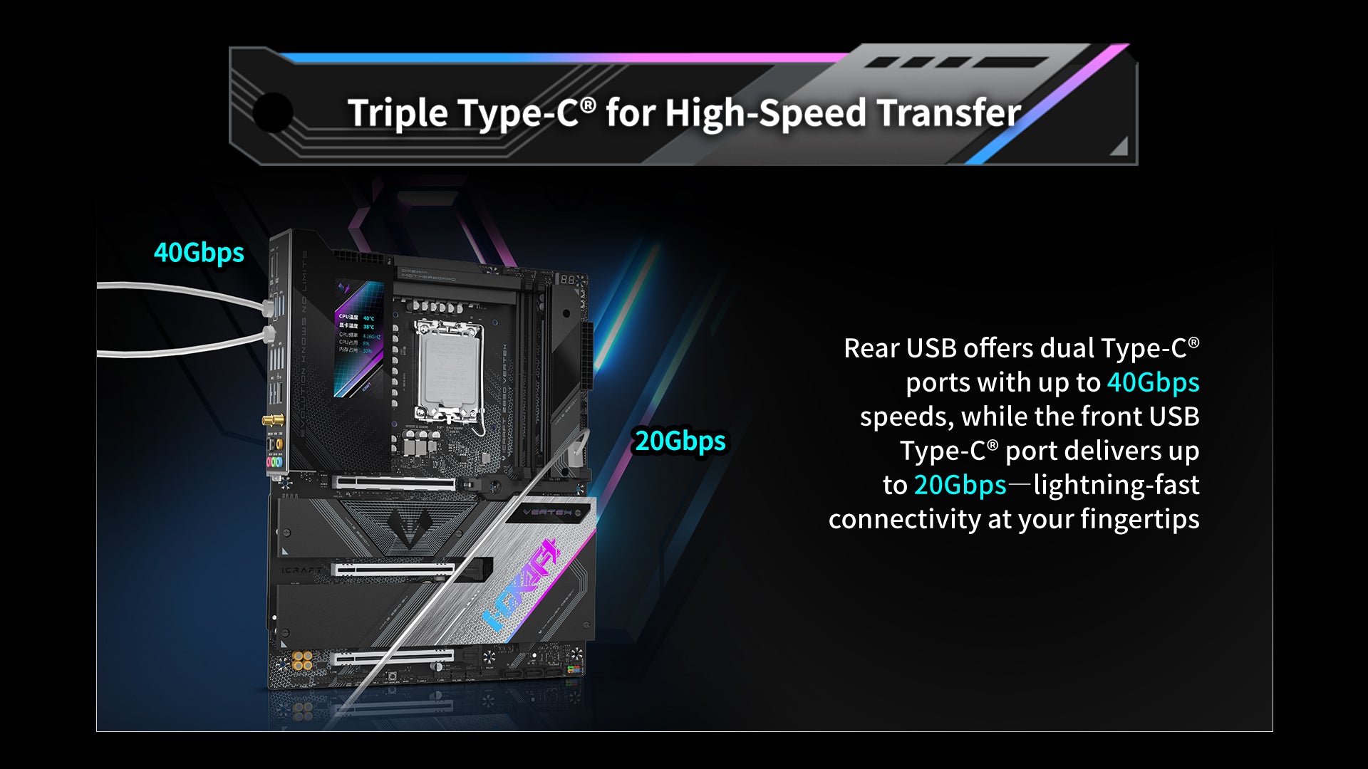 - Rear: 2 x USB 40G Type-C®, 9 x USB 10G Type-A.