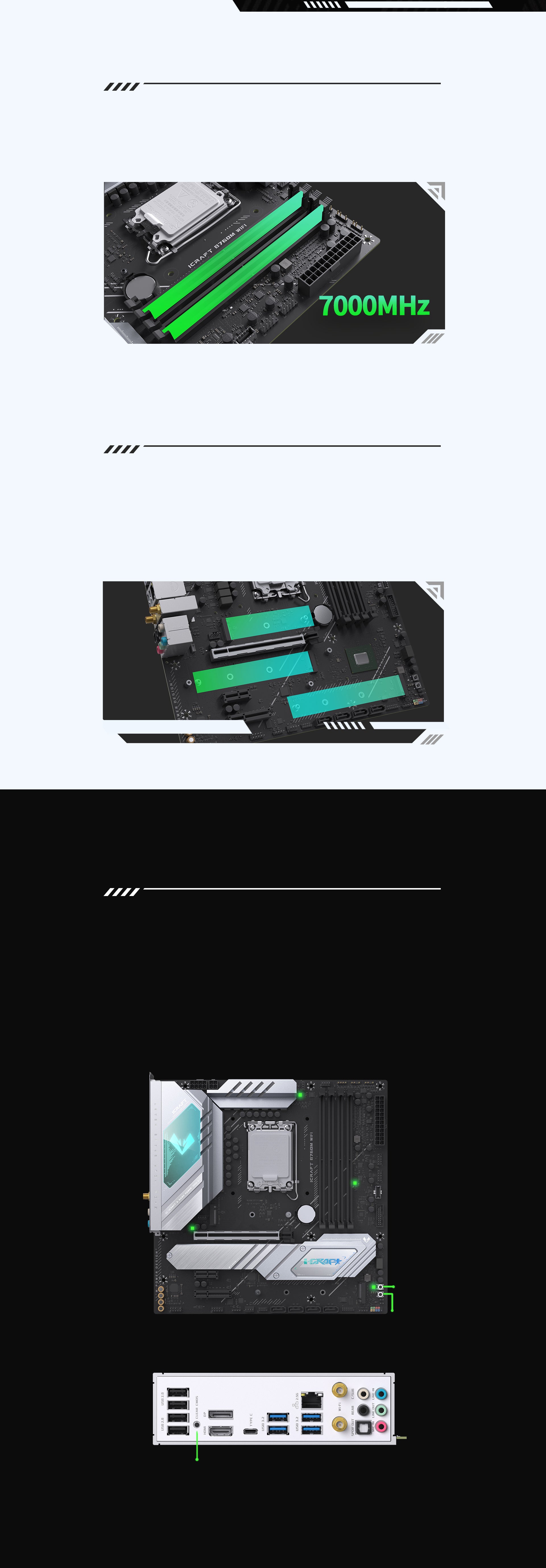 Equipped with four DDR5 memory slots, dual-channel support, XMP support, 2/4 slots with 7000MHz/OC+ overclocking potential