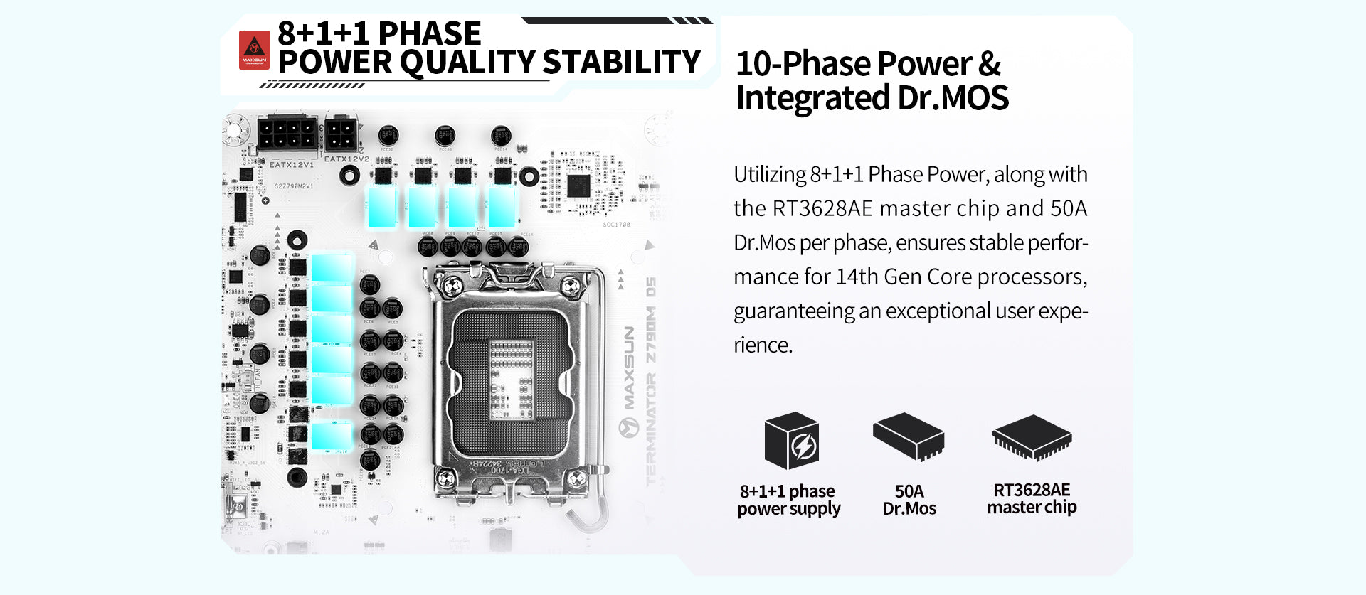 - 8+1+1 Power Phases: Robust power for overclocking with 50A Dr.Mos.