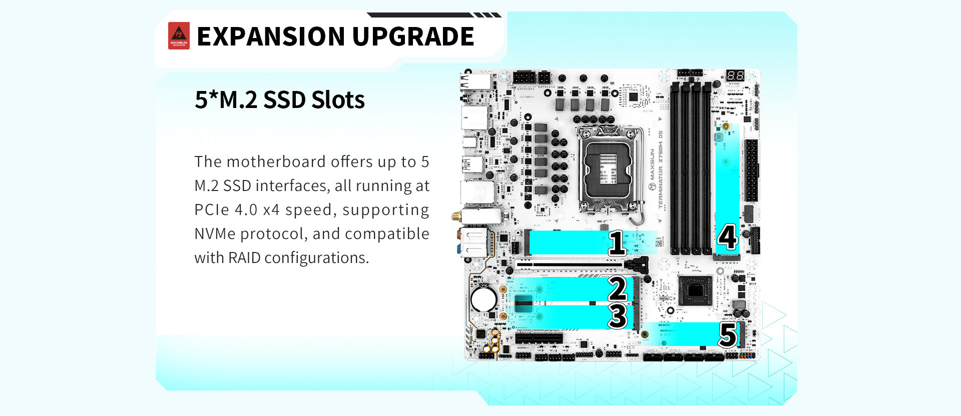 - 5x M.2 Slots: PCIe 4.0, NVMe support, RAID ready.