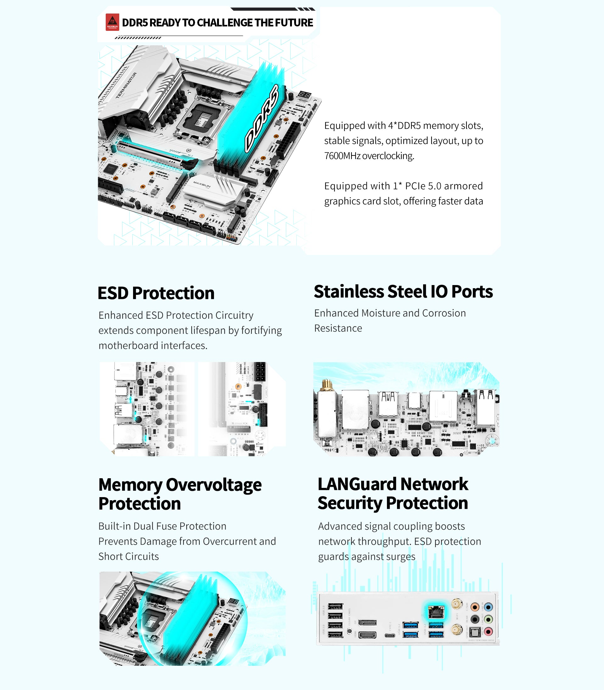 - DDR5 Memory: 4 slots, up to 192GB, 7000MHz+ OC.